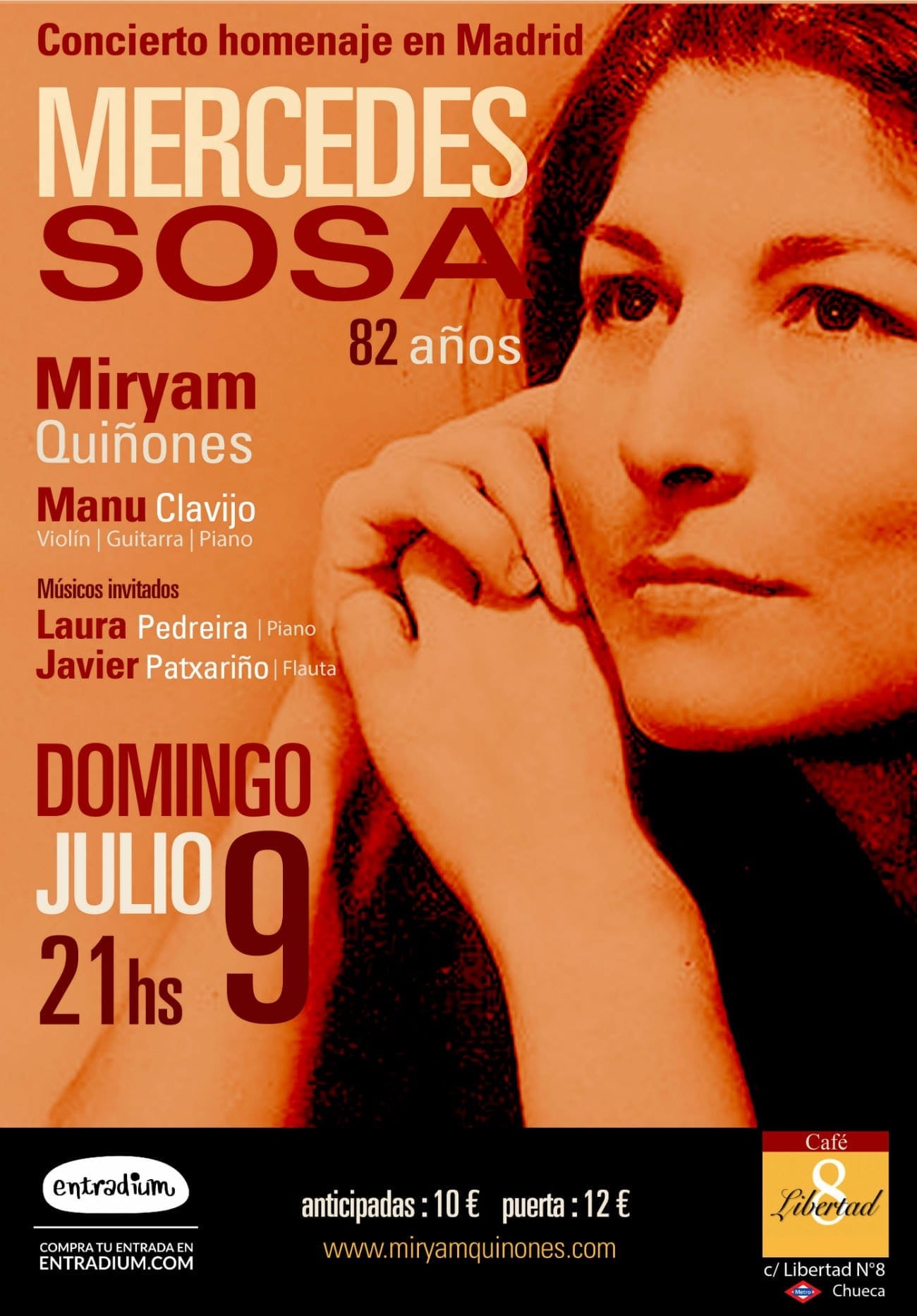 El 9 de julio la gran Mercedes Sosa, La Negra, cumpliría 82 años y para celebrarlo, porque el eco de las grandes voces siempre es infinito y la infinitud es obligatorio celebrarla, la cantora peruana Miryam Quiñones va a ofrecer un recital en el Café Libertad 8 rodeada de buenos músicos como Manu Clavijo, Laura Pedreira y Javier Patxariño. Las entradas se pueden comprar en entradium.