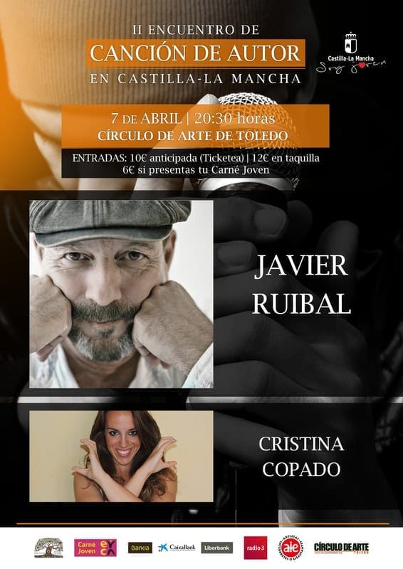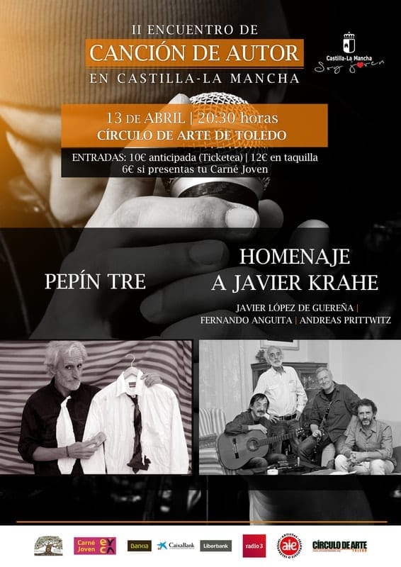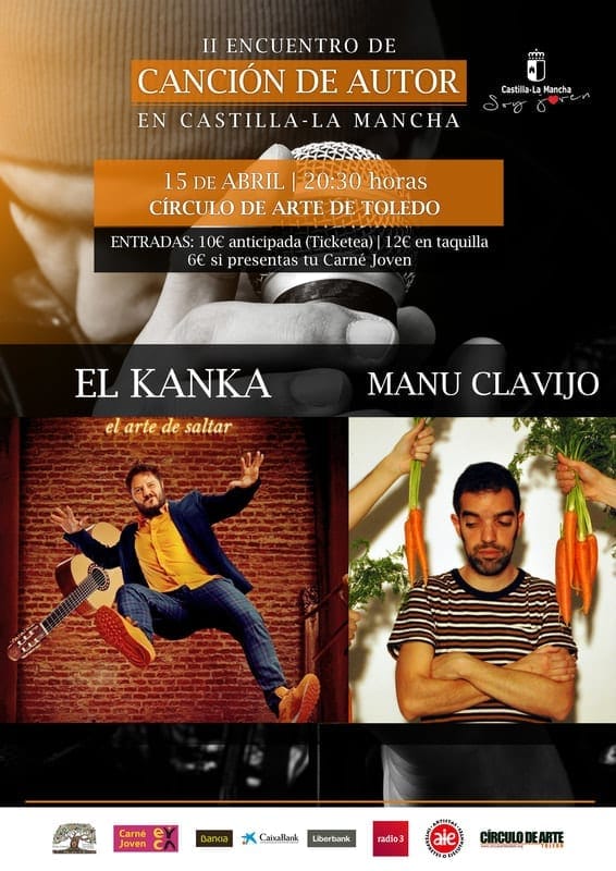 Hoy comienza el II Encuentro de canción de autor de Castilla La Mancha. Durante algo más de una semana la ciudad de Toledo se va a llenar de música a base de conciertos en el Círculo de Arte de Toledo, videoforums sobre la historia de la canción de autor en el Albergue San Servando, y actividades en centros escolares. Y además de esas actividades a las que puede asistir todo el mundo, Toledo también se llenará de música ya que un grupo de 24 jóvenes estarán durante una semana en el Albergue San Servando recibiendo diversos talleres relacionados con la creación, composición y grabación de canciones. El encuentro lo organiza Kali Panoa (en su web hay más información sobre el mismo) y las entradas para los conciertos en el Círculo de Arte se pueden comprar en el siguiente enlace: https://www.ticketea.com/entradas-concierto-ii-encuentro-cancion-de-autor-de-castilla-la-mancha-toledo/