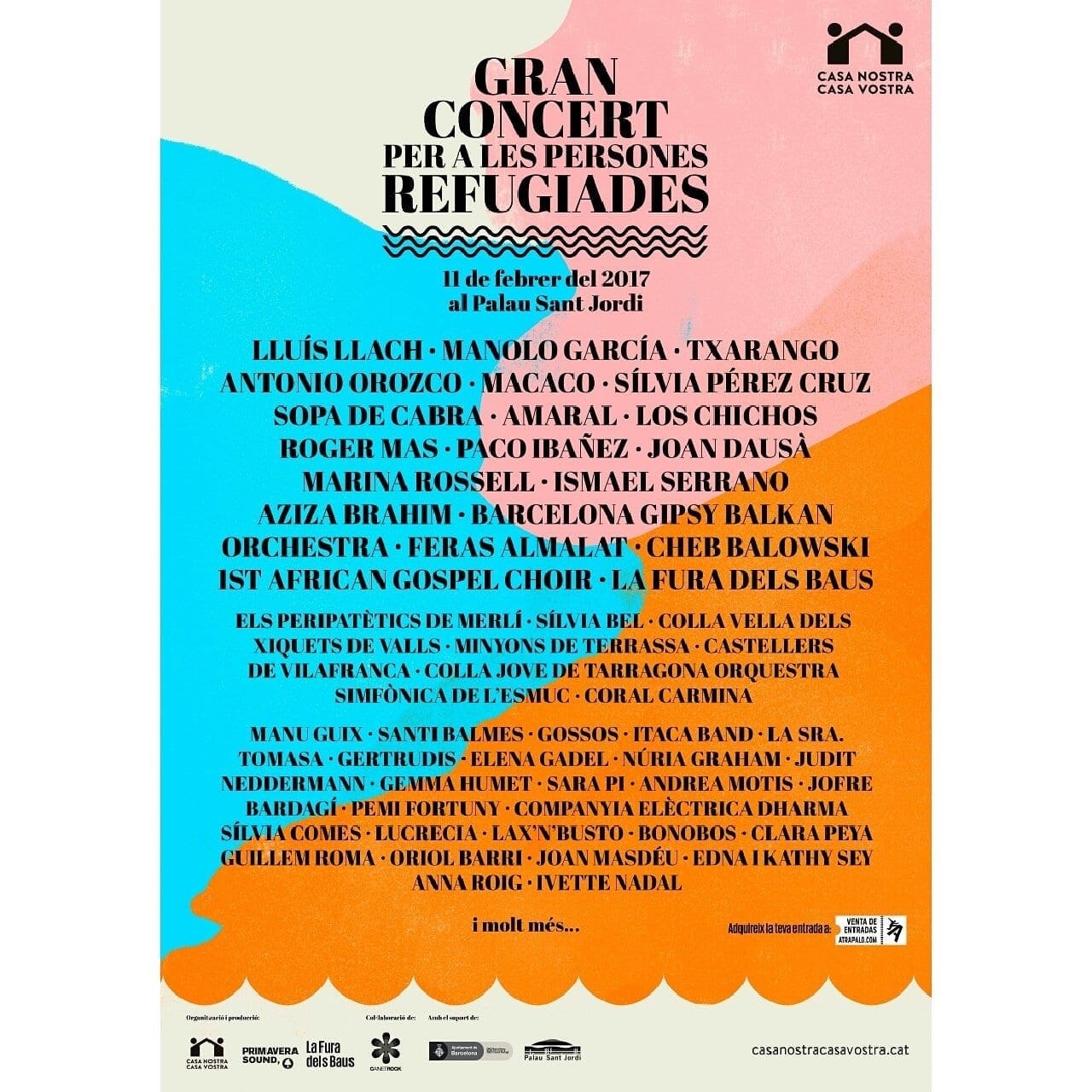 Desde este blog quiero mostrar todo mi apoyo a iniciativas artísticas que apoyen causas tan dignas como la de Casa Nostra Casa Vostra. Deseo, desde este texto, hacer sonar mi aplauso a Joan Manuel Serrat (que por cierto tengo noticias de que llegó el primero a la grabación y cuando le ofrecieron grabar su parte e irse, él mismo dijo que se quedaba a ver y apoyar a todos los demás y grabaría el último) y a todas las personas involucradas en este maravilloso Mediterráneo. Y para finalizar este texto anunciar que, además de este vídeo de la canción Mediterráneo y otra seria de acciones que se pueden consultar en la web de Casa Nostra Casa Vostra, la campaña de #VolemAcollir finalizará en el Palau Sant Jordi el próximo 11 de febrero con un gran concierto en el que participarán Lluis Llach, Silvia Pérez Cruz, Ismael SerranoPaco Ibañez y Marina Rossell entre otros artistas. Debajo de estas líneas se puede ver el cartel del concierto.